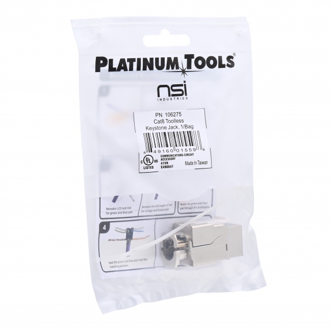 The Platinum Tools Cat8 Keystones offer an easier way to terminate. These keystones utilize a tool less design to make terminations on oversized cables a breeze. Simply strip your cable jacket, split the pairs, align into the correct slots, trim excess and snap closed.