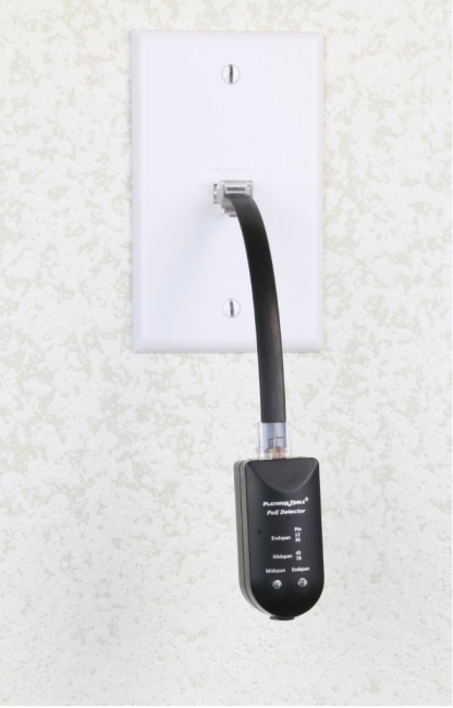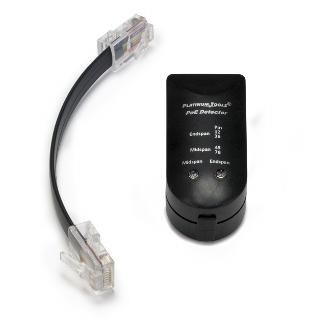 The Platinum Tools pocket-size PoE Detector detects PoE end/mid-span voltages on network cables. LED indicators instantly show “GO/NO-GO” detection on PoE networks. Plug cables directly into the builtin RJ45 jack or use the included patch card to detect voltage in wall jacks. Differentiates between end-span PoE power which is supplied from PoE switches or router and mid-span voltage from injectors. End-span detection indicate voltages are found on pairs 1/2, 3/6; mid-span detection indicates voltages found on pairs 4/5, 7/8.